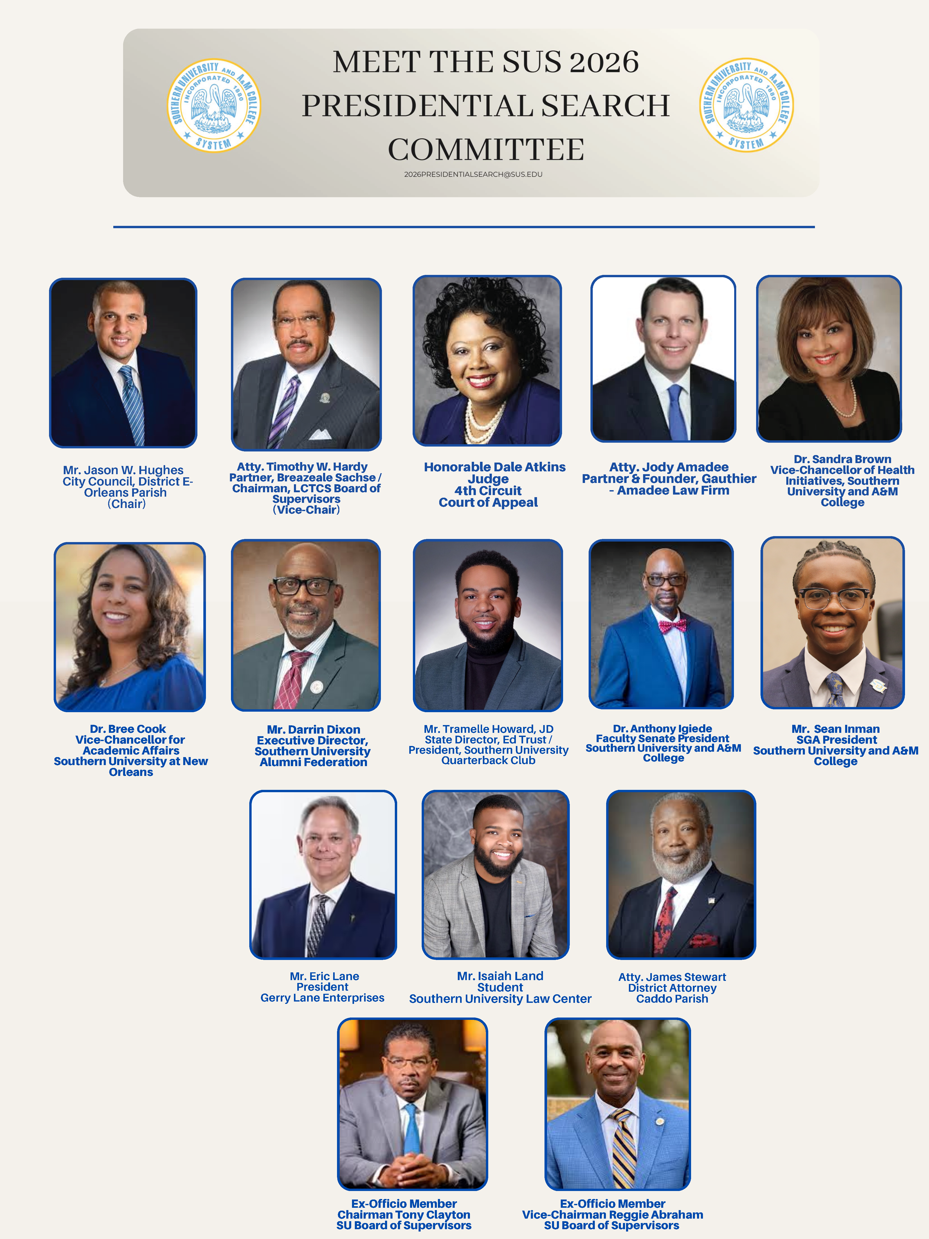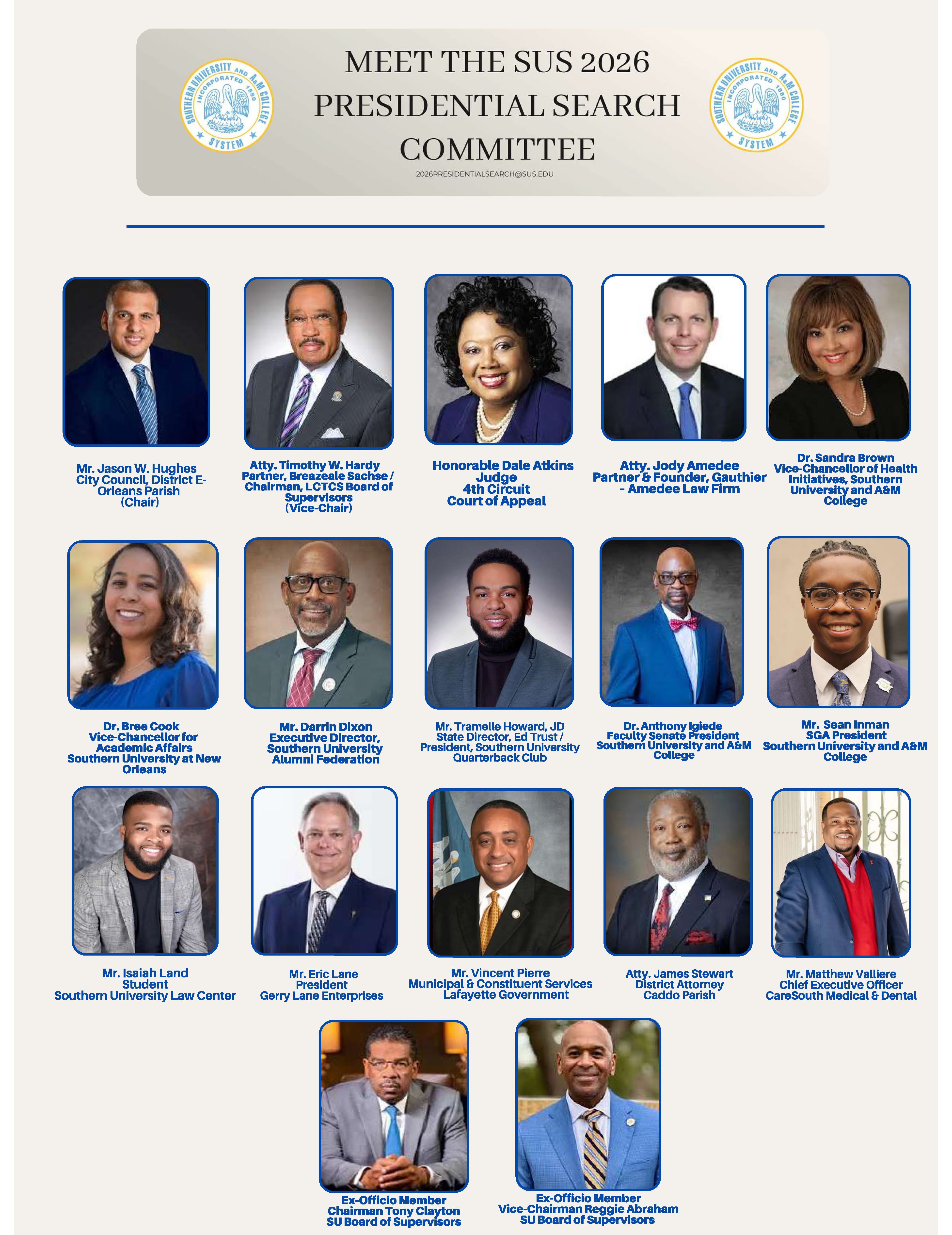 “The selection of our next president marks an important moment in the history of our System,” Clayton said. “This distinguished committee will ensure a thorough, well-structured search reflective of our values as the nation’s only historically black university system.”